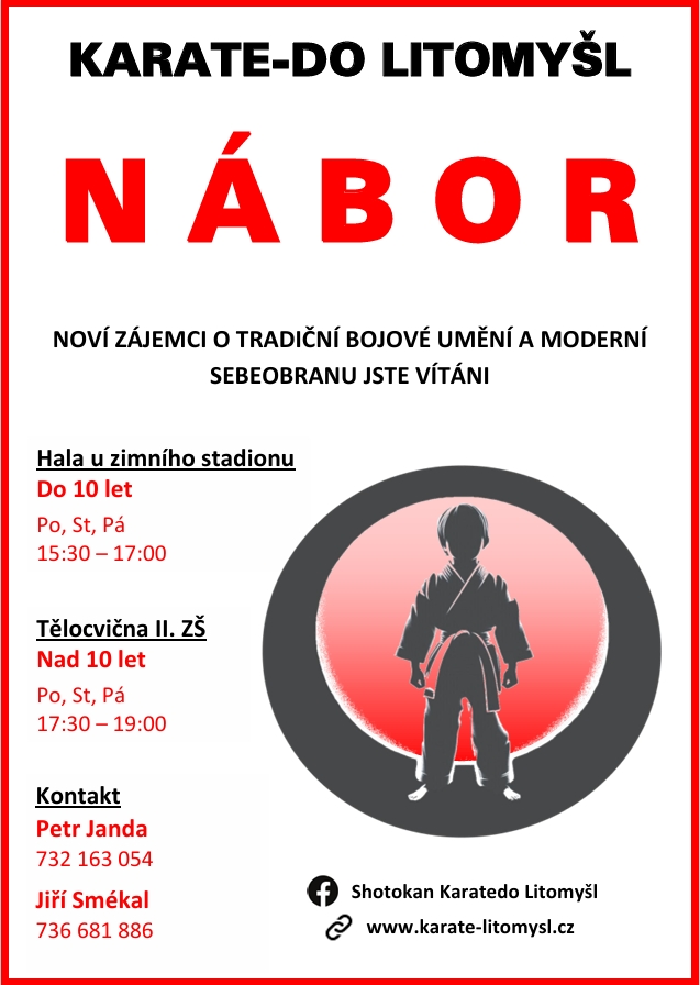 Od roku 1982 se litomyšlský oddíl Shotokan Karatedo věnuje tomuto starému bojovému umění z Okinawy. Vychovali jsme množství talentovaných závodníků, ale i sebevědomých a úspěšných lidí. Na trénincích se můžete potkat nejen s mistry republiky, ale i mistry světa ve svých kategoriích. Ze začátku to možná ani nepostřehnete, později pochopíte. Karate totiž není jenom o rozvoji fyzické síly a obratnosti, ale také duševního a mravního života cvičenců, které vychovává k pokoře a úctě k druhému.